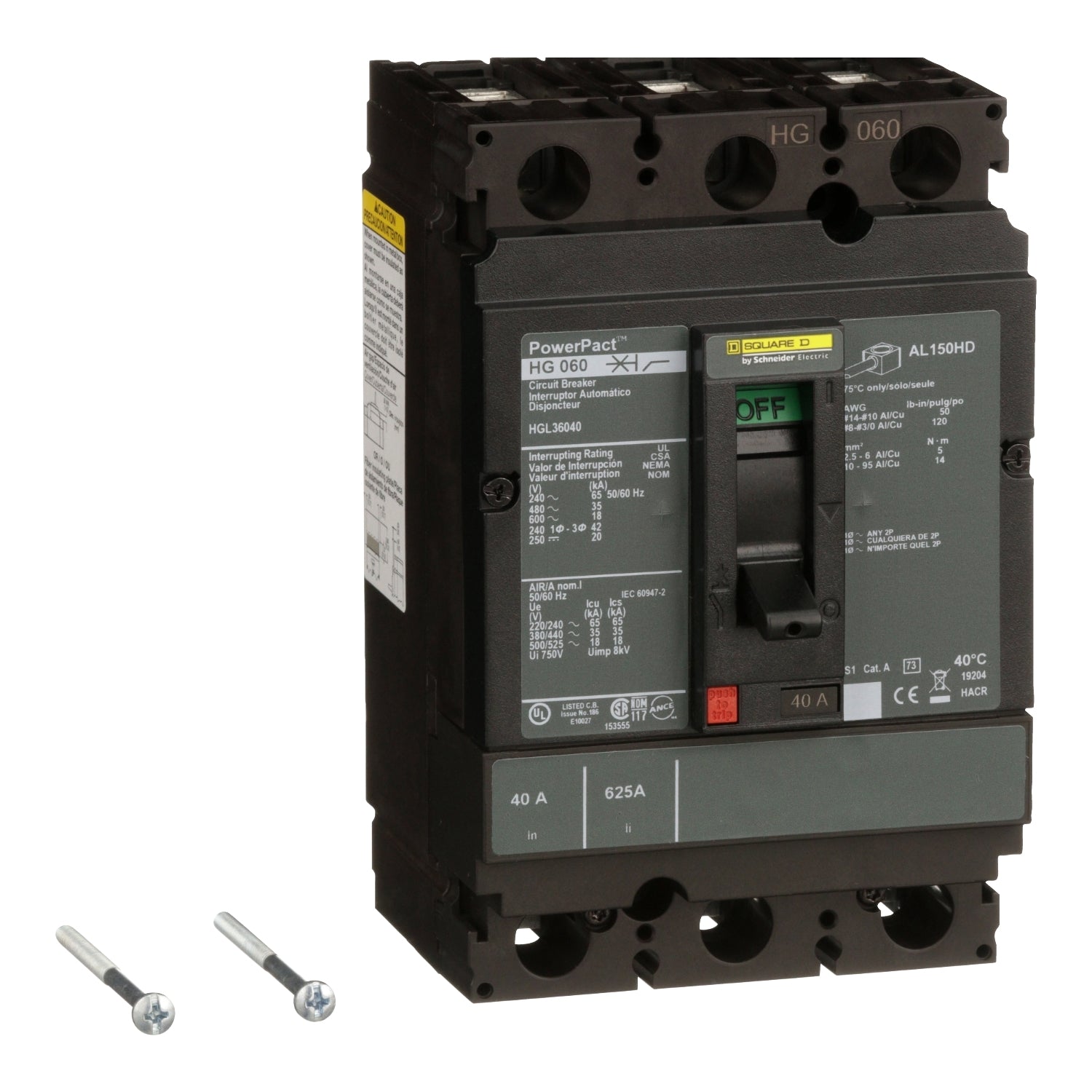 The HJL36040 is a PowerPacT H-Frame circuit breaker, engineered to safeguard electrical systems against overload and short circuit hazards. It is equipped with thermal magnetic circuit protection, offering a breaking capacity of 25kA at 600VAC. Featuring dual-break rotating contacts, it minimizes peak current during short circuit faults. The breaker includes an integral push-to-trip button for manual circuit interruption. Available in both 2 and 3-pole configurations, it supports unit mount and I-Line installations. This specific model, a 40A, 3-pole breaker, boasts lugs on both line and load sides. With a continuous current rating of 80%, it adheres to UL, CSA, NOM, and IEC standards and carries the CE mark.