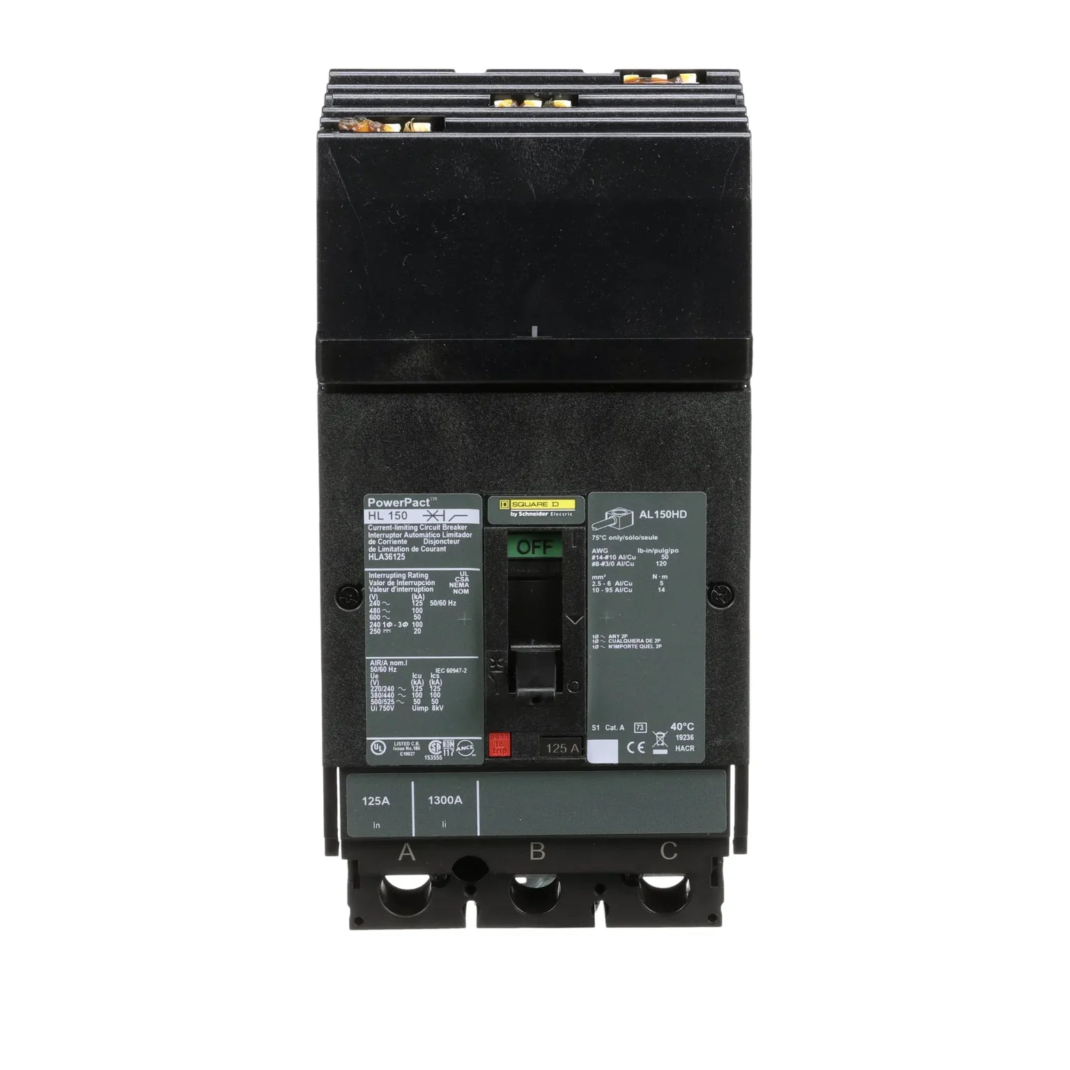 The HLA36125 is a molded case circuit breaker specifically designed for reliable and robust overcurrent protection in electrical distribution systems. Classified under the circuit breaker category, this device is engineered to interrupt excessive current flow to prevent equipment damage and mitigate potential hazards associated with electrical overloads and short circuits. With a voltage rating of 600V, it is suitable for deployment in high-voltage applications, ensuring compatibility across a broad range of industrial, commercial, and institutional electrical systems. This voltage capacity provides the necessary insulation and arc resistance to support safe operations in systems with higher power demands, aligning with industry standards for secure high-voltage circuit protection.