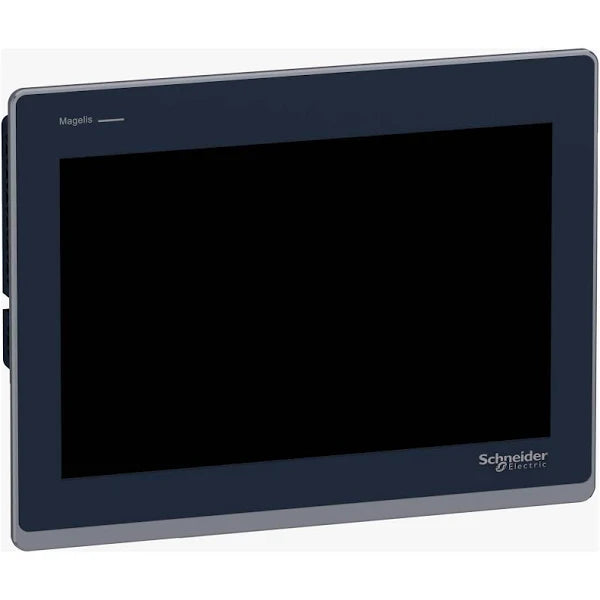 This Basic HMI panel belongs to the Schneider Electric Harmony ST6 range. This single touch resistive HMI is made of alluminium front panel with a multi-color status indicator showing the various operating modes. This HMI interface is 12.1 inch wide with 16 million colors and 1,280 x 800 pixel resolution (WXGA). It is powered by EcoStruxure Operator Terminal Expert software for intuitive user experience. It has a 800 MHz ARM Cortex-A8 CPU, 1 GB device memory, 128 MB user data memory, and 512 KB backup memory. This HMI ST6 supports 2x Ethernet port, COM1 (RS-232C), COM2 (RS-485), 1x USB 2.0 Type A, and 1x USB 2.0 Micro-B port. Its dimensions are 313mm (width) x 235mm (height) x 50mm (depth) and weighs 1.80Kg. This is intended for indsutries like packaging, food & beverage, textile, HVAC equipment, and compressors, and also for end users looking for maintenance of their Web devices. It conforms to standards like EN (61000-6-4, 61000-6-2, 61131-2), UL 61010-2-201, CSA C22.2 No 61010-2-201 and certifications like CSA, CE, China RoHS, KC, REACH. This range is designed to meet the needs of simple machine operators for good visualization, connectivity, cybersecurity with EcoStruxure Secure Connect Advisor, and cost effective equipment. The various degree of protection are IP65F, Type 1, Type 4X (indoor use only), Type 13 (on the front panel when properly installed in an enclosure).