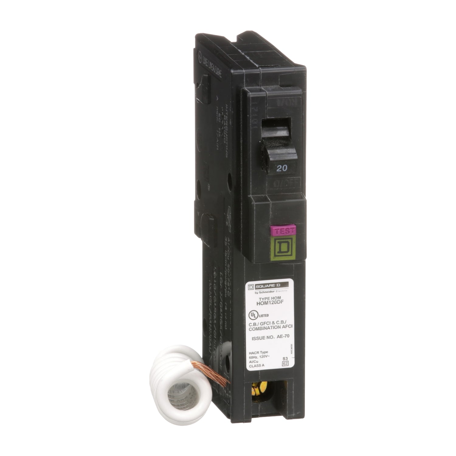 The HOM120DF is a Mini Circuit Breaker from the Homeline series. It is designed for 20A, 1 Pole, and operates at 120VAC. This breaker has a 10kA interrupting rating (AIR) and features a combination of arc fault and ground fault protection. It is designed for plug-in mounting in Homeline load centers and is HACR rated.