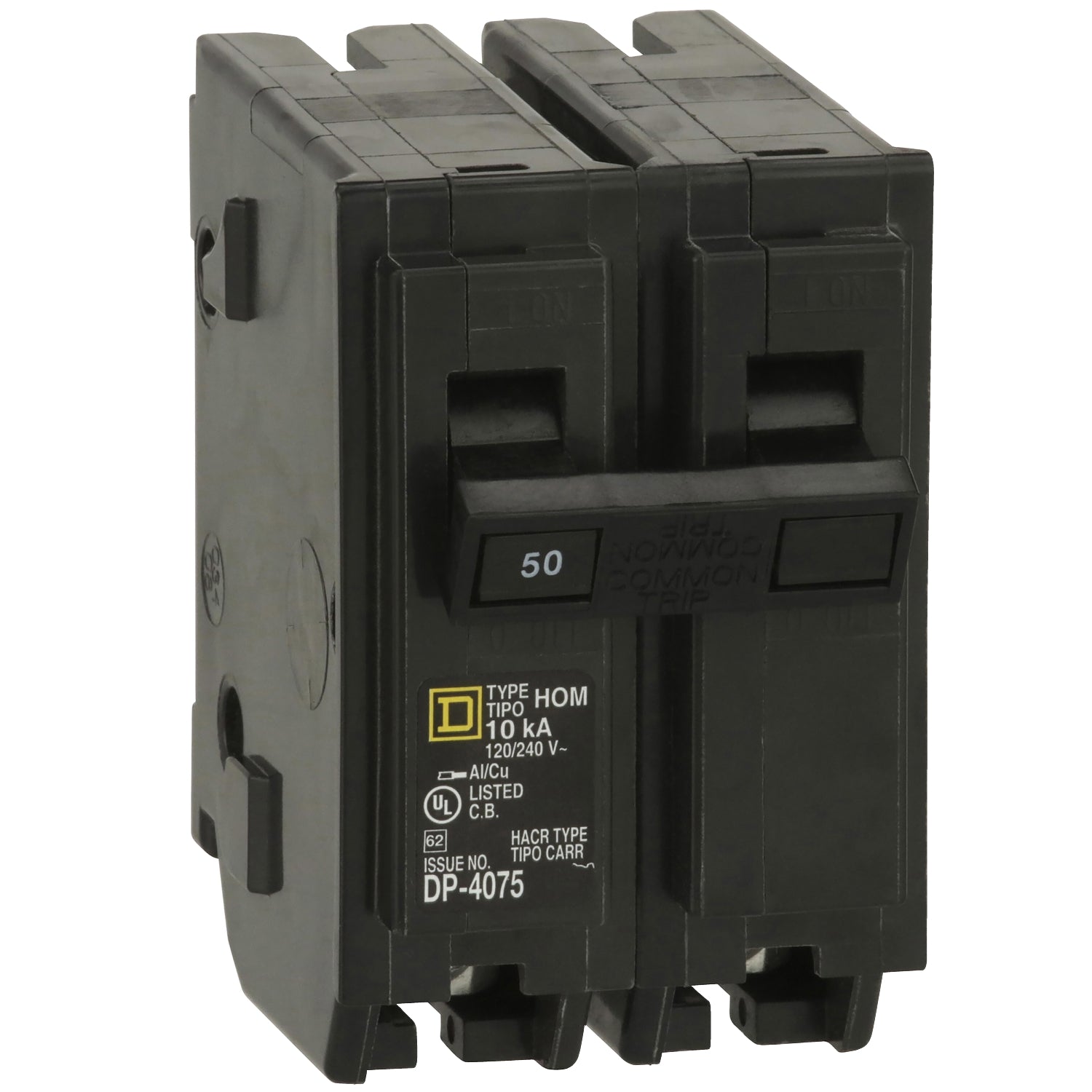 HOM250, Square D, Homeline, Type HOM, 2P, 1PH, 50A, 240V, 10kA@240V, standard interrupting capacity, 40°C, Plug-In, Thermal Magnetic molded case circuit breakers.