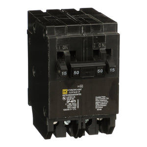 HOMT1515250, Square D, Homeline, type HOMT, 4P, 1PH, 50A, 240V, 10kA@240V, quad tandem, 1P-15A/15A, 2P- 50A,standard interrupting capacity, 40°C, Plug-In, Thermal Magnetic molded case circuit breakers.