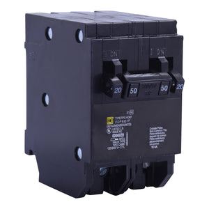 The HOMT2020250CP is a Homeline quad tandem circuit breaker designed for fast installation and superior circuit protection. This miniature circuit breaker plugs into Homeline load centers and occupies two pole spaces. It features a two-pole breaker rated at 50A for 120/240 VAC in the middle and two single-pole breakers rated at 20A each for 120/240 VAC on each side. The quad tandem circuit breaker provides standard circuit protection, is HACR rated, and has a breaking capacity of 10 kA.