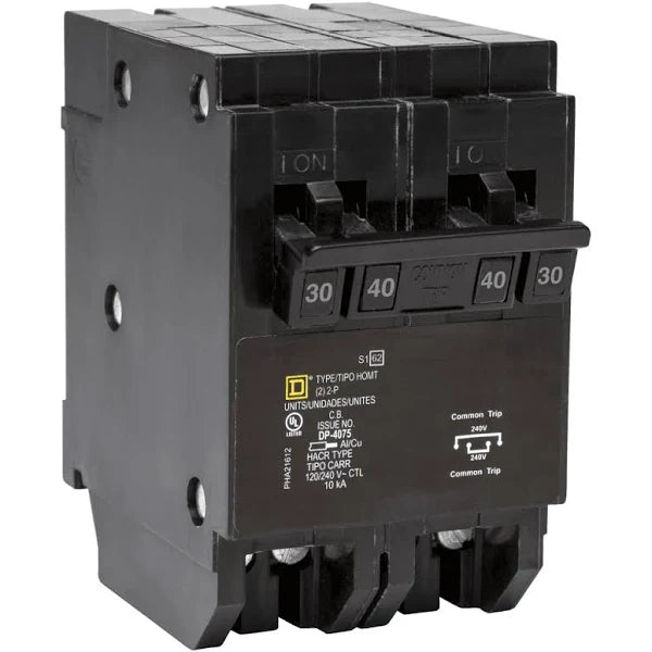Comprising a combination of two 2-pole breakers, the Quad Tandem Circuit Breaker adheres to standardized circuit protection protocols and carries the HACR rating. One of the 2-pole breakers is rated at 30A for operation at 120/240 VAC, while the other is rated at 40A within the same voltage range. This configuration ensures versatile applicability to various electrical systems with different load requirements.