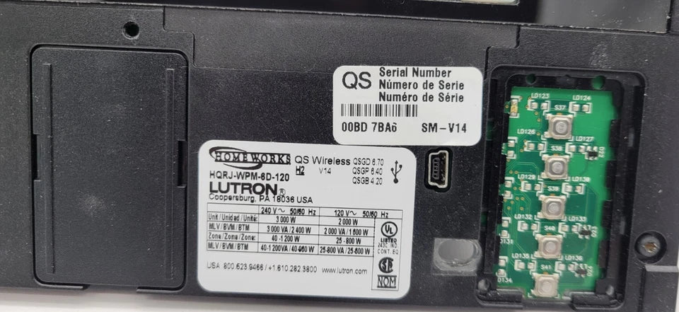 The Lutron HQRJ-WPM-6D-120 is a wireless 6-zone Wallbox Power Module designed for HomeWorks QS and RadioRA 2 systems. It delivers advanced dimming and switching capabilities across a broad spectrum of lighting load types, including LED, halogen, ELV/MLV, and more. Its compact wall-mountable form enables flexible installation and integration with QS wired or RF links.