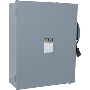 The Schneider Electric HU464 is a heavy-duty, non-fusible safety switch. With a rating of 200A, 4 poles, and handling capacity up to 150hp at 600VAC/DC, it ensures robust electrical safety in industrial settings, featuring a NEMA 1 enclosure for indoor use.