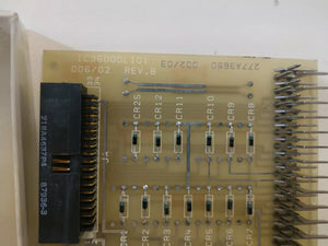 The IC3600DLIG1 is a diode interface board manufactured by General Electric for their Speedtronic Mark I and Mark II Turbine lines. Gas and steam turbines are employed as efficient sources of energy generation, utilizing internal combustion engines for gas turbines and large boilers for steam turbines. The IC3600DLIG1 features two large black plastic male terminal ports and fifty metal male terminal prongs, facilitating communication with surrounding circuit boards. Equipped with twenty-seven small black diodes, the IC3600DLIG1 regulates energy flow, allowing it to pass only in a single direction. The metal male terminal prongs are labeled with numbers ranging from zero to fifty, while the diodes are identified with the letter C followed by numerical designations. Additionally, the circuit board bears General Electric's emblem for authentication.