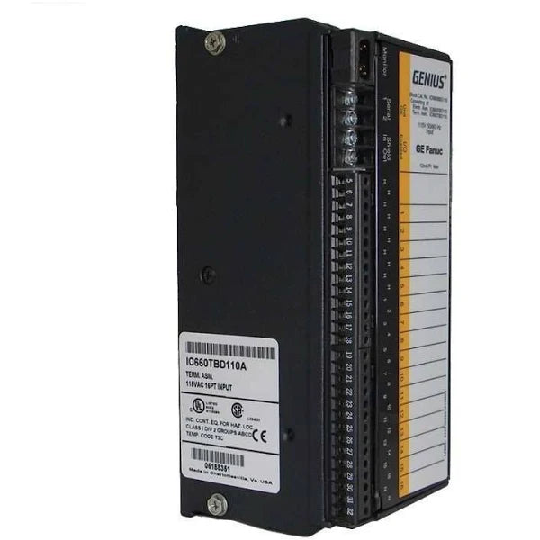 The Ge Fanuc IC660BBD110 is an intelligent 16-point discrete input block. This module is a 115VAC discrete input block, with operating voltage range of 93-132VAC, 47-63 Hz. This module directly communicates to the processor or communication adapter via the Genius protocol. This module supports right side up or upside-down orientation.