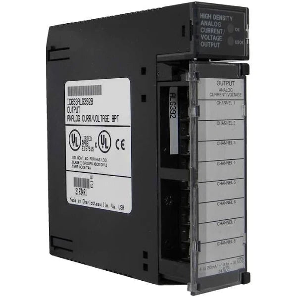 The IC693ALG392, manufactured by GE Fanuc, is a Series 90-30 module designed as an analog output module. It comprises eight single-ended output channels capable of providing 0 to +10 volts (unipolar) or -10 to +10 volts (bipolar) voltage outputs and 0 to 20 milliamps / 4 to 20 milliamps output signals. Each channel offers configurable resolution, allowing for either 15 or 16-bit resolution based on the selected output range.