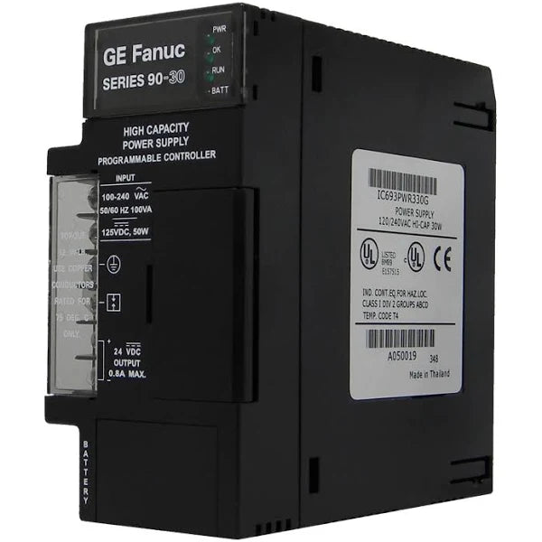 The GE Fanuc IC693PWR330 is a High Capacity Power Supply module that is part of the GE Fanuc Series 90-30 platform. This power supply has load capacity of 30 Watts with nominal input voltage of 100 to 240 VAC or 125 VDC. It has output capacities of 30 watts @ 5VDC, 20 Watts @ 24VDC and 15 Watts @ +24VDC Relay.