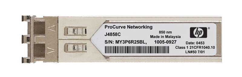 The J4858C is an HP Networking ProCurve compatible SFP optical transceiver module designed for 1.25Gbps Gigabit Ethernet applications. Supporting up to 550 meters over OM2 multimode fiber, it features DOM support and complies with MSA and IEEE 802.3z standards.