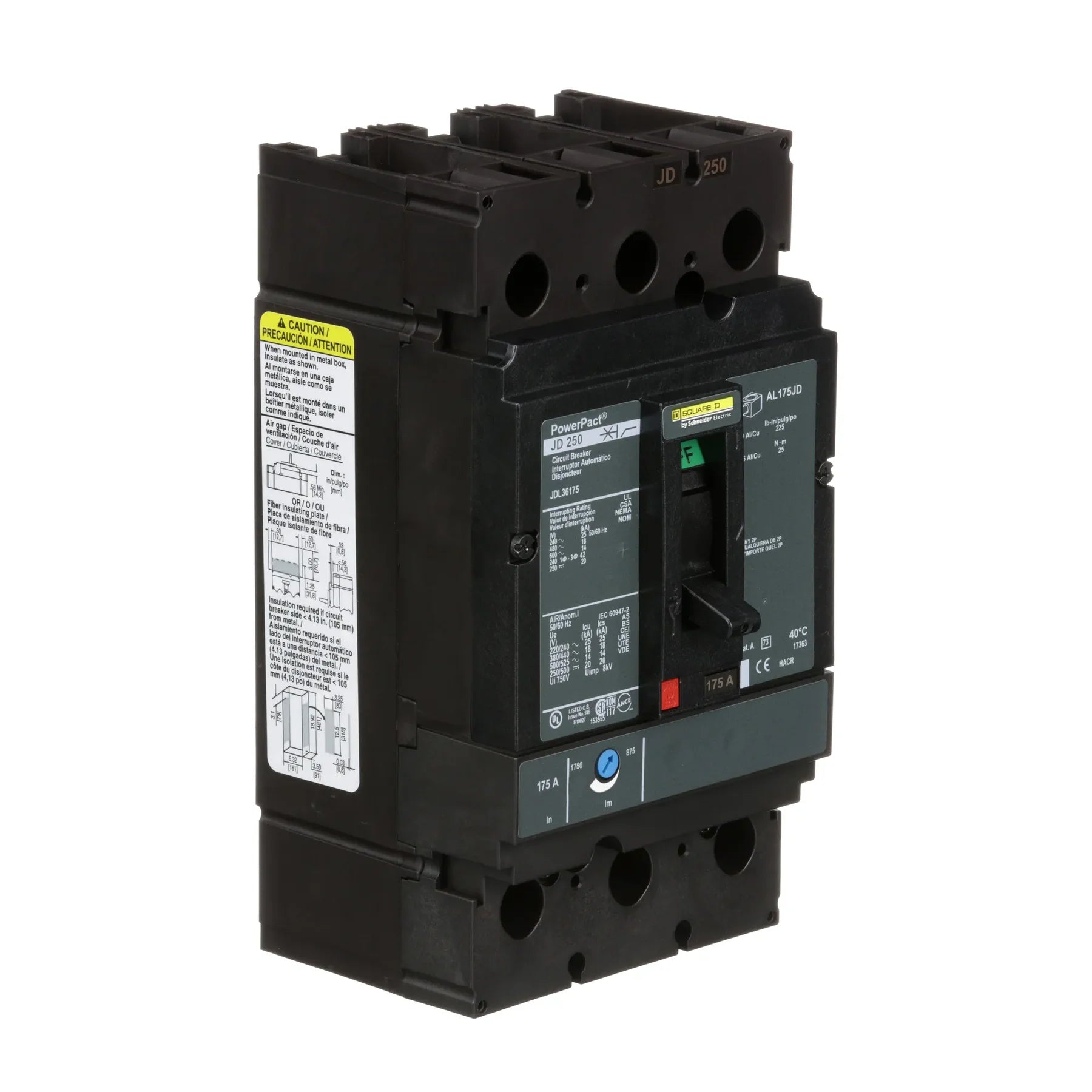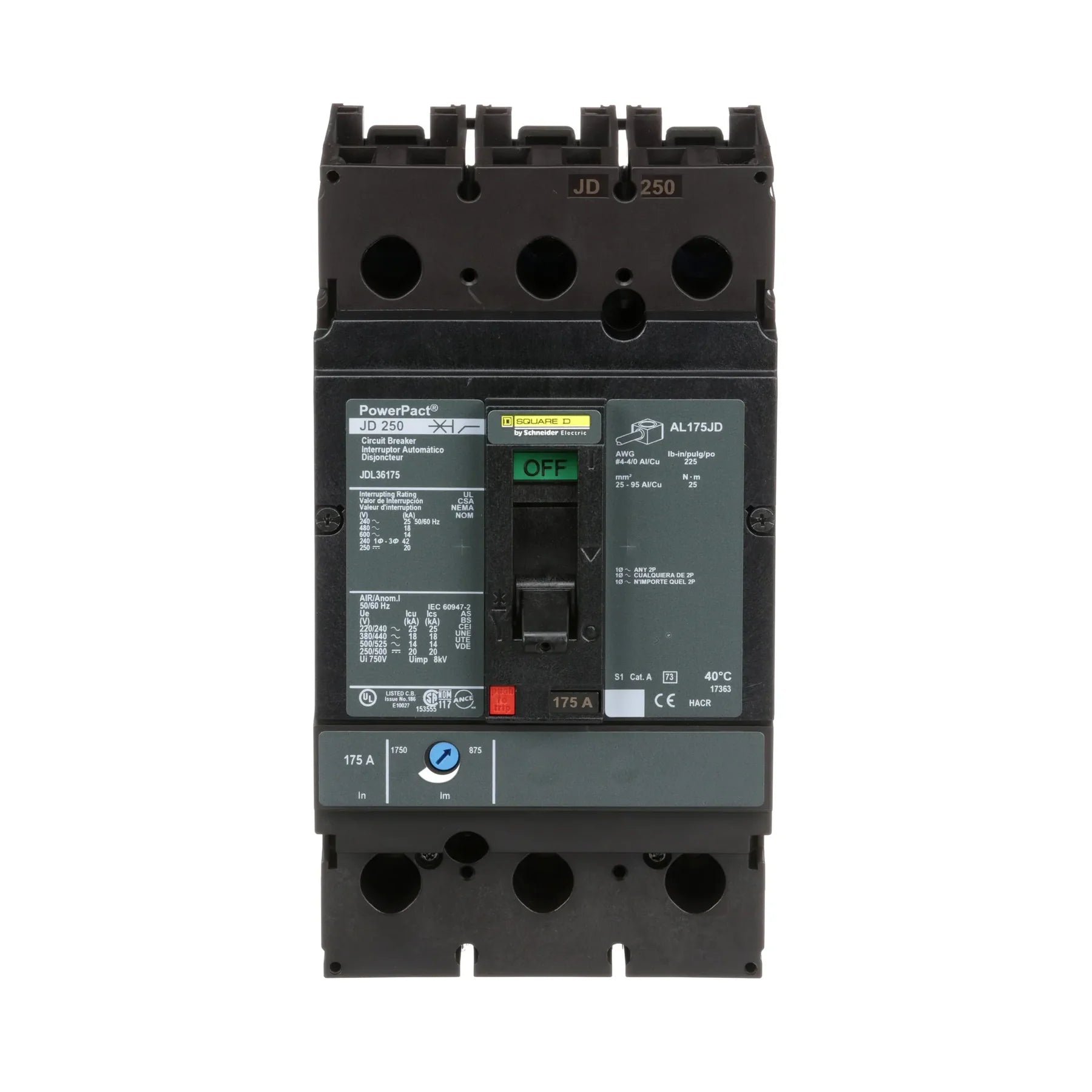 These circuit breakers are versatile, available in both 2 and 3-pole unit mount configurations as well as I-Line constructions. The JDL36175 model is equipped with lugs on both the line and load sides for secure electrical connections.