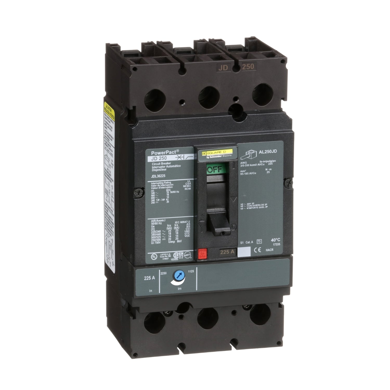 PowerPacT J circuit breakers are offered in 2 and 3-pole unit mount and I-Line constructions, providing flexibility in installation. The JDL36225 breaker is designed with lugs on both the line and load sides, ensuring secure connections.