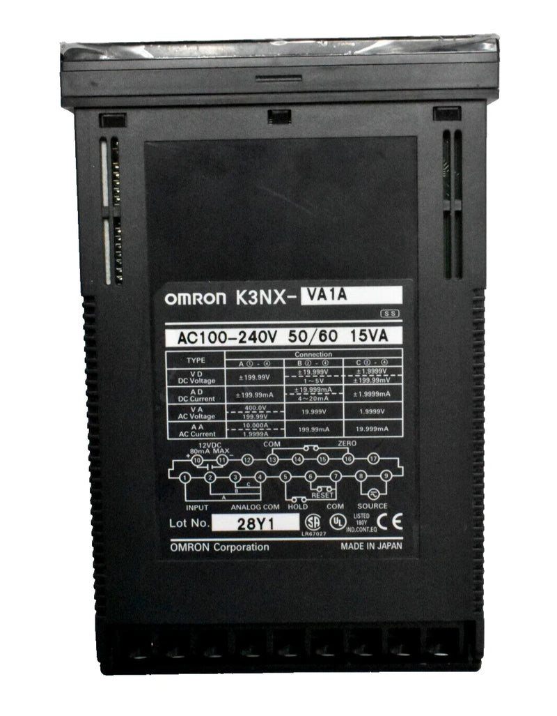 The K3NX-VA1A belongs to the Omron K3NX Series, a family of versatile process meters developed for accurate analog signal measurement and display in automation systems. This model accepts AC voltage inputs, providing precise readouts on a high-visibility digital display. The unit operates from a universal 100–240 VAC supply, consuming 15 VA of power, and offers straightforward setup with front-panel controls for calibration and range selection. Its compact design and durable construction make it suitable for use in electrical panels, test benches, and process monitoring stations. Designed for long-term reliability, the K3NX-VA1A meets Omron’s standards for accuracy, stability, and safety compliance in industrial measurement applications.