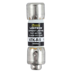 Cooper / Bussmann KTK-R series 5 ampere limitron group class cc rejection fast acting characteristics power fuse with maximum voltage rating of 600V and high interrupting rating of 20 kiloampere at 600Vac used on fast acting fuses to protect control circuit transformers and melamine tube ferrule terminal fuses.
