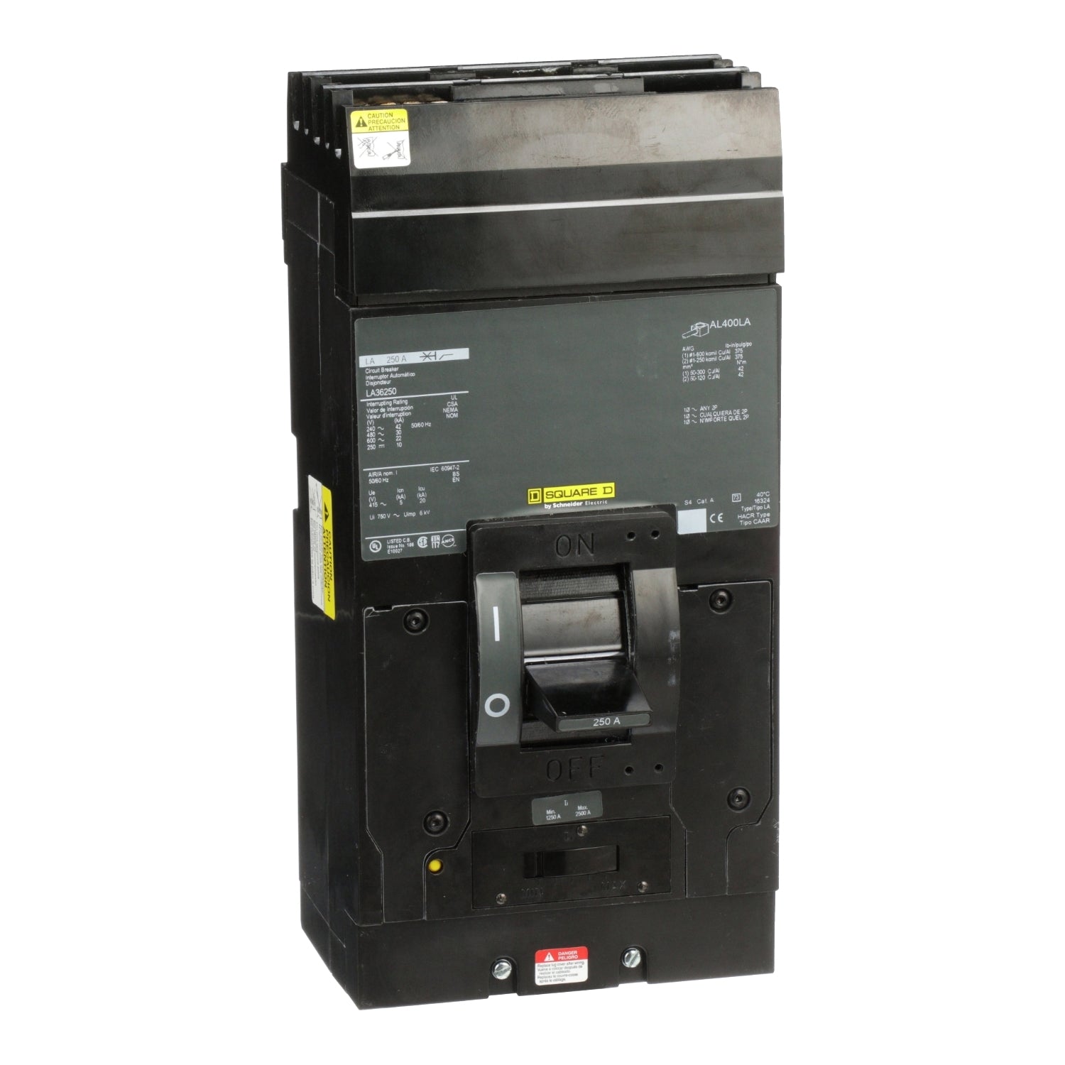 The LA36250 is an I-Line™ circuit breaker designed by Square D™ for power distribution in AC or DC systems. These circuit breakers are integral components of cULus-certified panelboards, complying with UL and CSA standards under UL File E33139. They are suitable for use as service entrance equipment and are available in configurations ranging from 400A to 1200A for main lugs only, and 100A to 1200A for main circuit breakers.