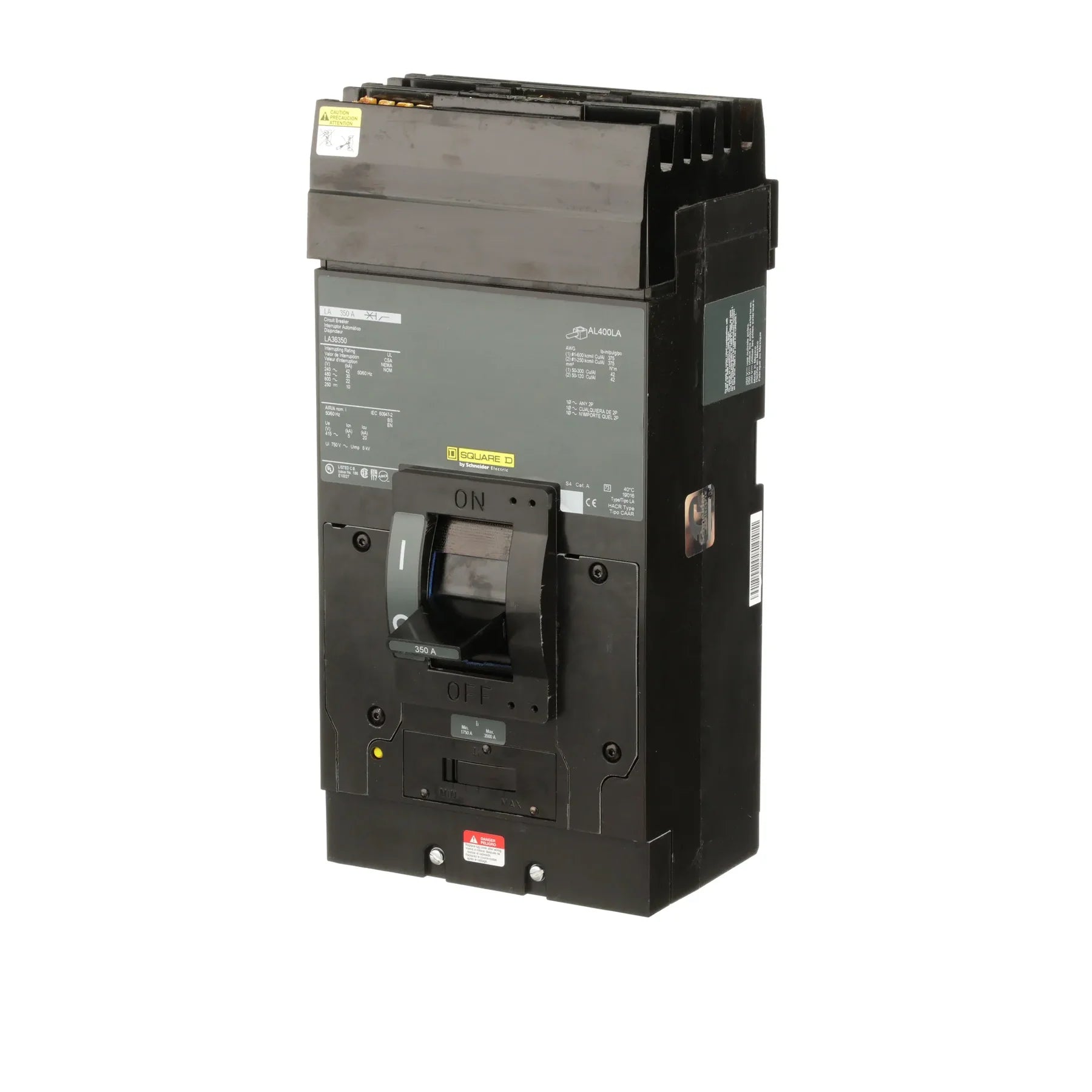 The LA36350 is a Schneider Electric circuit breaker belonging to the I-Line family, specifically designed as an L-frame type breaker. It operates at a voltage rating of 600V AC with a high current handling capacity of 350 amps, making it suitable for robust industrial applications requiring substantial electrical protection.