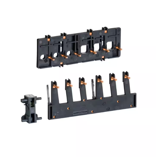 The kit includes several key components essential for its functionality. One of the primary components is the mechanical interlock, designated as LAD9V2. This mechanical interlock is crucial for preventing the simultaneous closure of the contactors, thereby ensuring safe operation without the need for electrical interlocking. Additionally, the kit comprises a set of three parallel bars, identified as LAD9V5, and a set of three reverser bars, identified as LAD9V6. These bars are necessary for the proper power connection and alignment of the contactors.