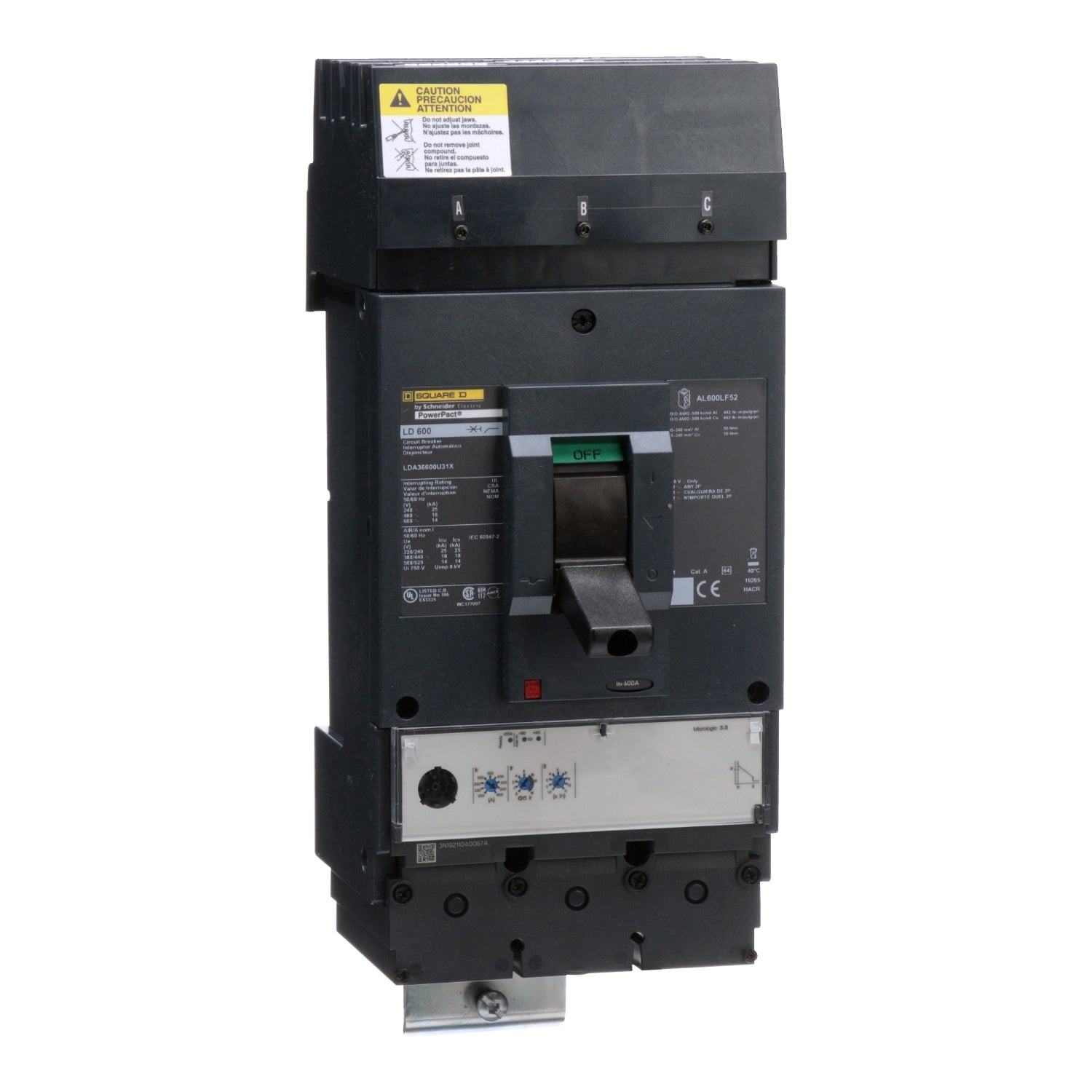 The LDA36600U31X is a PowerPacT L-Frame circuit breaker manufactured by Schneider Electric. This circuit breaker is rated at 600A and operates at 600VAC with a 14kA interrupting capacity. It features a 3-pole configuration and an I-Line mounting style. The circuit breaker includes a MicroLogic 3.3 trip unit with LI (Long-Time and Instantaneous) protection functions. The continuous current rating is 80%, and it uses an ABC phase connection.