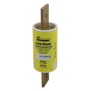 The Eaton LPJ-125SP is a fuse with a current rating of 125 Amps and a voltage rating of 600VAC, 300VDC. It has an interrupting rating of 300kAIC at 600VAC, 200kAIC at 300VDC. The LPJ-125SP has a blade terminal connection.