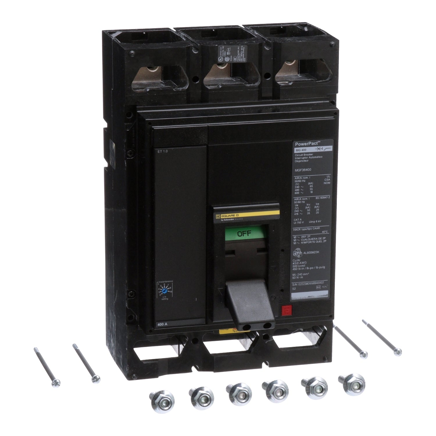 The MGL36400 Circuit Breaker, part of the PowerPacT M series, is designed to safeguard electrical systems against overloads and short circuits. Featuring an electronic trip unit, specifically the ET 1.0, the PowerPacT M-Frame circuit breakers offer reliable protection. They are equipped with an integral push-to-trip button on the cover for manual operation.