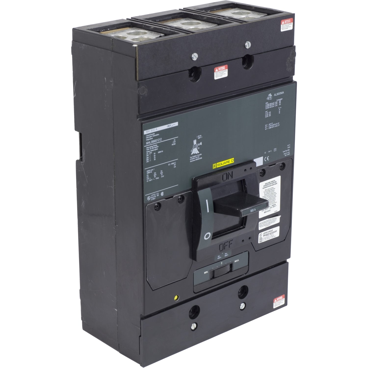 MHL368001212, Square D, MHL Series, type MHL, 3P, 3PH, 800A, 600V, 65kA@480V, high interrupting capacity, Feed-Thru, complete with 1A/1B auxiliary switch and non-interchangeable trip LI - Long-Time and Instantaneous trip functions and line & load side lug terminals, Thermal Magnetic molded case circuit breakers.