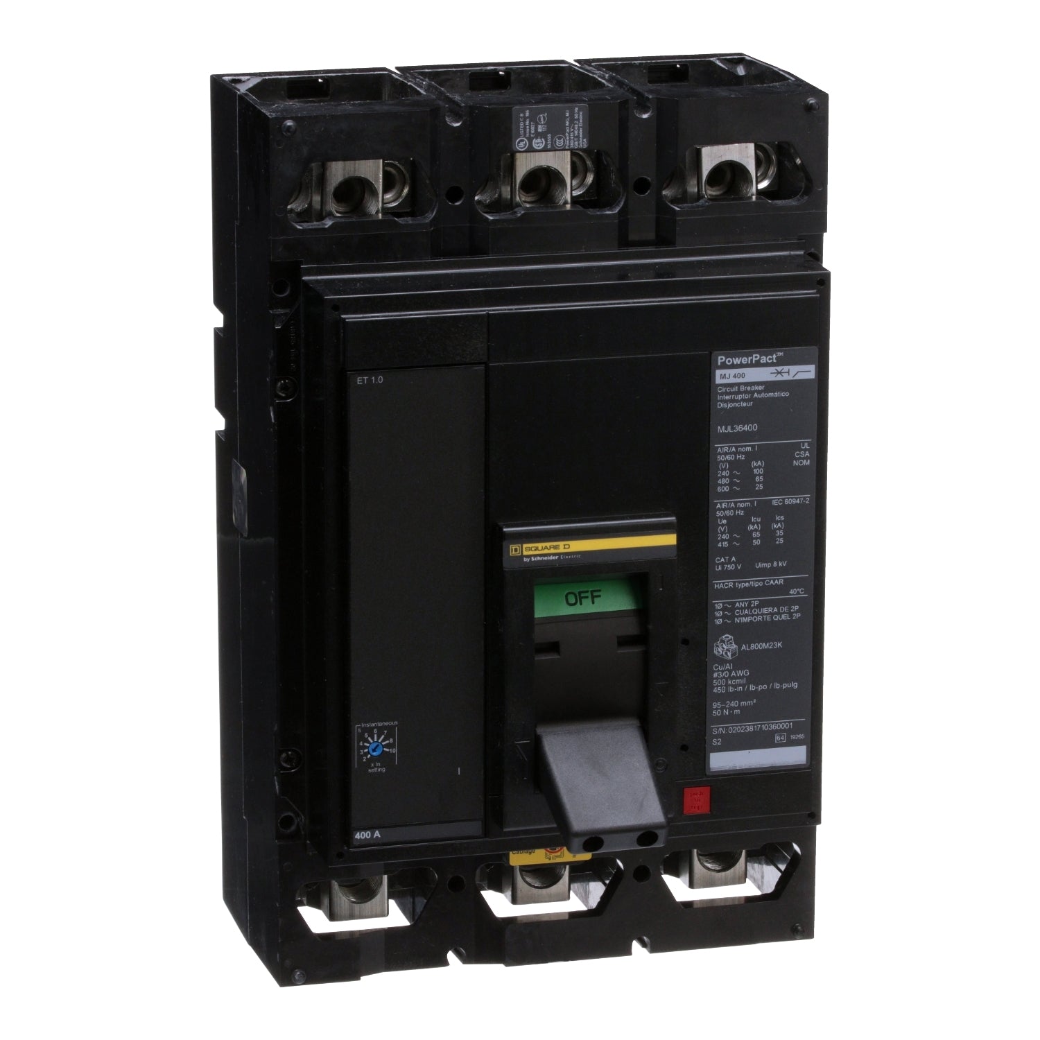 MJL36400, Square D,Schneider Electric, Powerpact, type MJL, 3P, 3PH, 400A, 600V, 65kA@480V, UL listed, current limiting, Feed-Thru, complete with basic non-interchangeable 1.0 trip, LI - Long-Time and Instantaneous trip functions and line & load side lug terminals, Solid State electronic, molded case circuit breakers.
