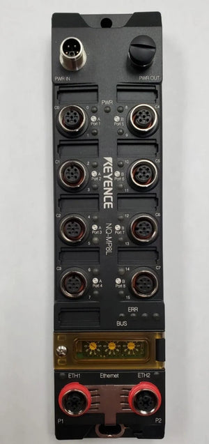 The Keyence NQ-MP8L is an 8-port multi-protocol IO-Link master module designed for industrial automation and sensor integration. Supporting EtherNet/IP™, PROFINET, and Modbus/TCP, it provides seamless communication between field devices and control systems with 10/100 Mbps network speed and rugged IP69K-rated construction.