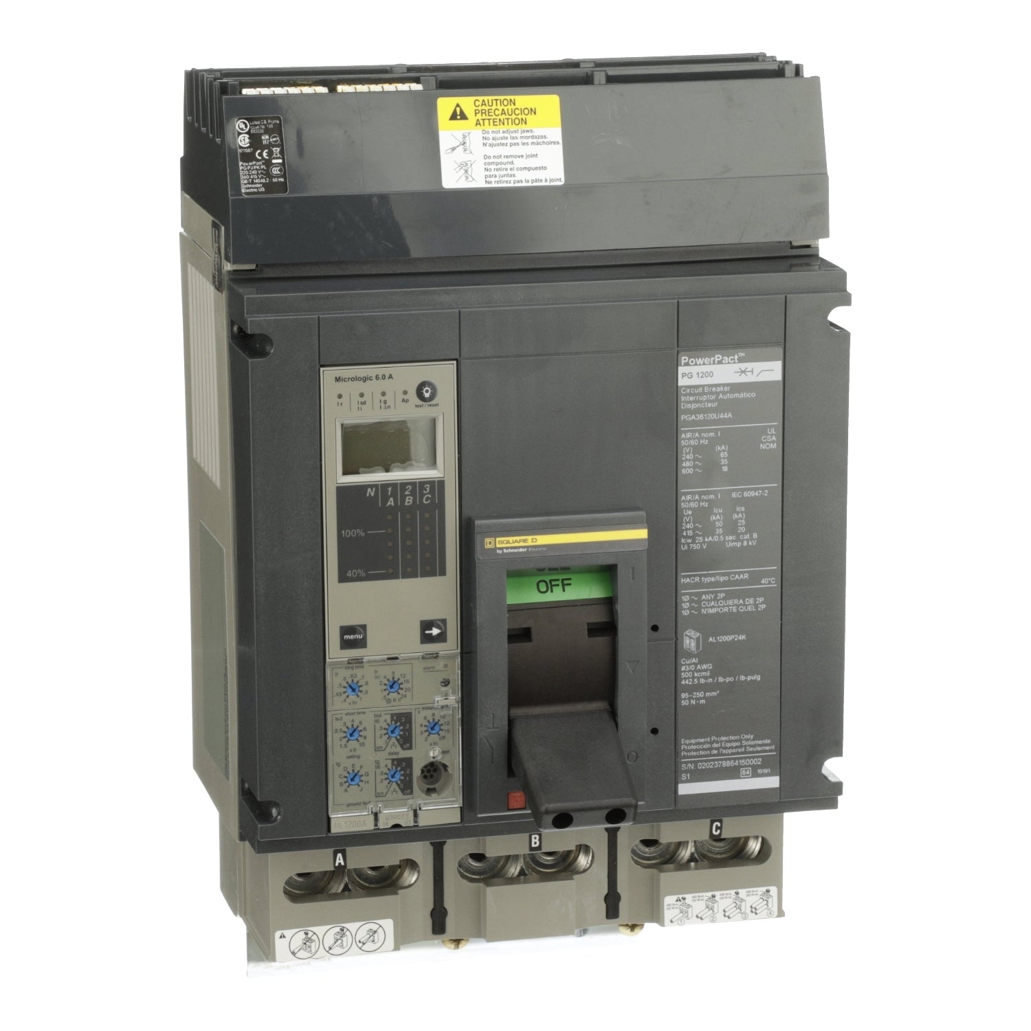 The PGA36120U44A is a Circuit Breaker belonging to the PowerPacT P series, designed specifically to safeguard electrical systems from potential damage resulting from overloads and short circuits. Featuring a robust construction, PowerPacT P-Frame circuit breakers are equipped with either a fixed long-time electronic trip unit, ET 1.0I, or Micrologic trip units, providing versatility in functionality.
