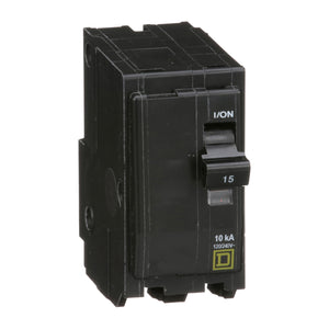 Square D Miniature Circuit Breaker, 120/240 VAC, 15 A, 50/60 Hz Frequency, 10 kA Interrupt, QO/100 A Frame, Thermal/Magnetic Trip, 2 Pole, 1 ph, Pressure Plate Connection, 14 to 10 AWG, 14 to 8 AWG Wire, Plug-On Mounting, 40 deg C, 3 in H x 1.5 in W x 2.91 in D Dimensions.