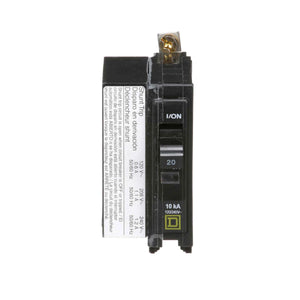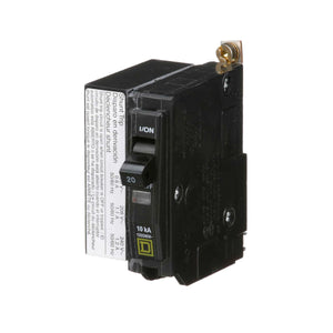 The QOB1201021 is a single-pole mini circuit breaker from Schneider Electric's QO series, designed for providing overcurrent protection and switching on AC and DC systems. Featuring a thermal magnetic mechanism with an over center, trip-free toggle action and positive handle indication, it includes VisiTrip for visual indication of tripping. This 20A breaker operates at 120/240VAC with a 10kA breaking capacity and utilizes bolt-on mounting.