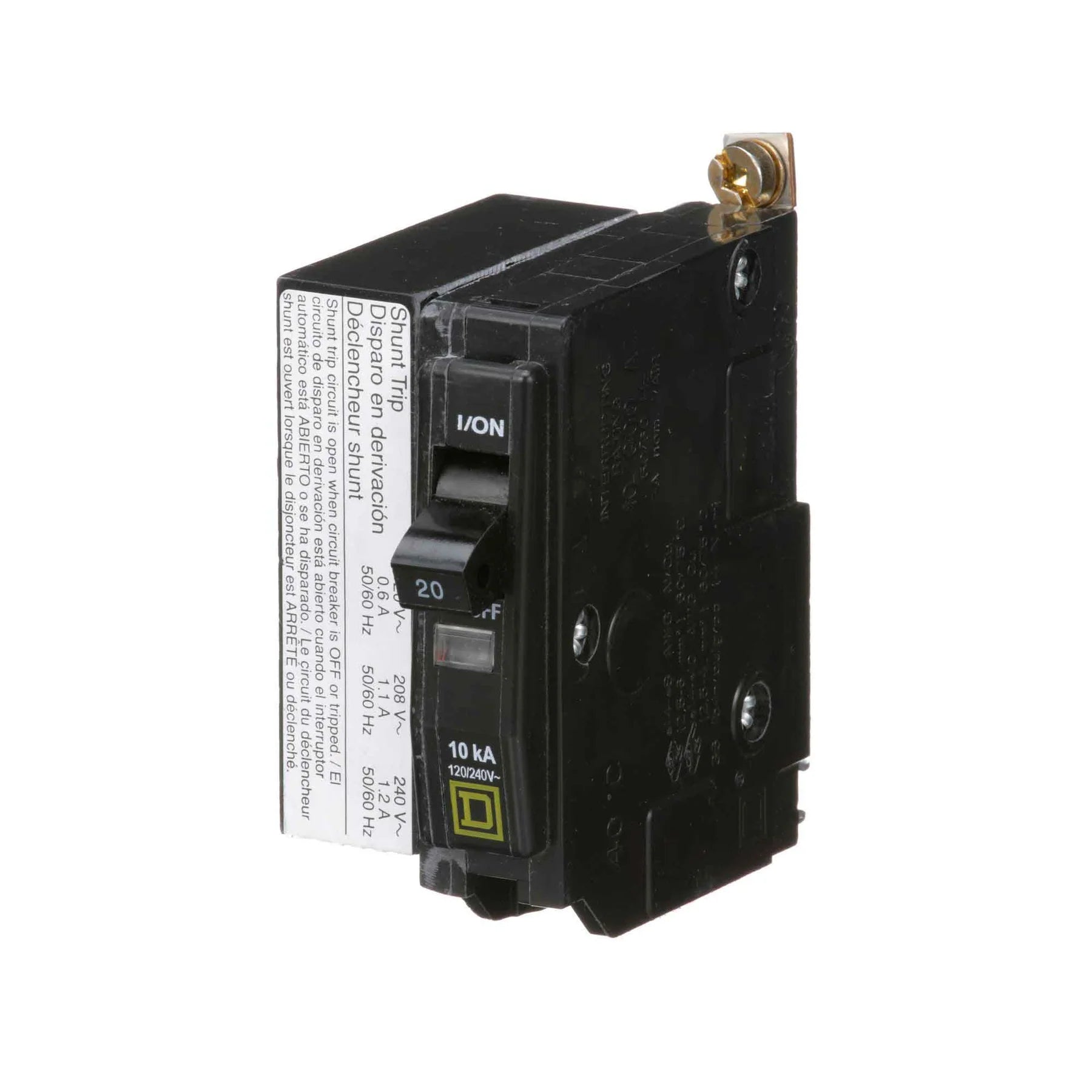 This 1-pole QO circuit breaker is rated for 20A at 120/240VAC operational voltage. It has a breaking capacity of 10kA and utilizes a bolt-on mounting system for secure installation. The QOB1201021 model includes an AC shunt trip option, adding flexibility for specialized applications.