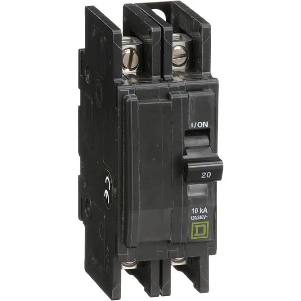 The QOU220 is a two-pole circuit breaker rated at 20A, 240VAC, with a breaking capacity of 10kA. It is compatible with a range of accessories. The slotted box lugs accommodate wire sizes ranging from 14 AWG to 2 AWG for both copper and aluminum wires.
