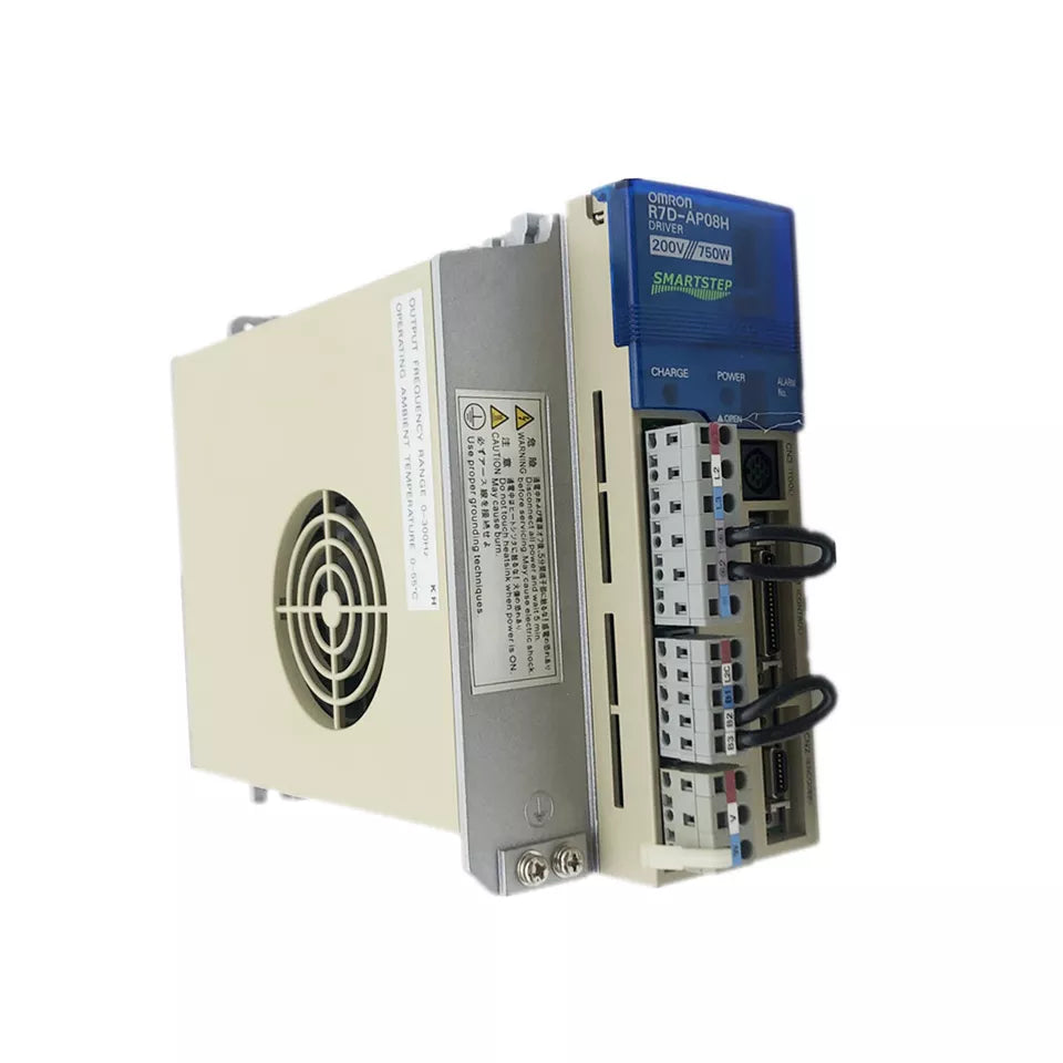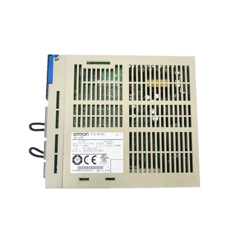 The Omron R7D-AP08H is a 750 W AC servo drive designed for precise motion control in industrial applications. It accepts single-phase 200–230 VAC input and delivers three-phase output with advanced all-digital servo control for high-performance motor operation.