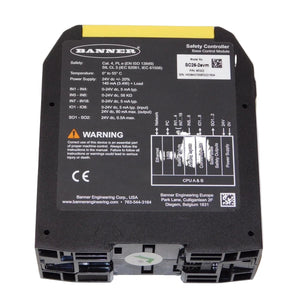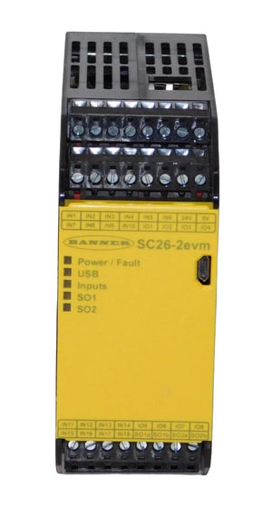 The SC26-2EVM is part of Banner’s SC Series of safety controllers, engineered to replace multiple safety relays with a single programmable platform. It supports up to 26 input devices and provides two independent safety outputs, enabling flexible configuration for diverse applications. The integrated Ethernet/IP and Modbus TCP communication capabilities allow real-time status reporting and network-level diagnostics. With its compact housing and simple configuration software, the SC26-2EVM is widely applied in robotic systems, conveyors, packaging machinery, and other automated processes.