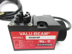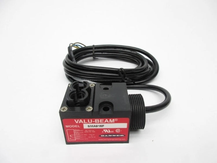 The Banner Engineering SMA915F is a VALU-BEAM series photoelectric sensor designed for object detection using glass fiber optic technology. It operates on a 90–130 VAC power supply and provides an SPDT relay output for direct control of industrial loads. This sensor is engineered for dependable performance in automation systems requiring AC-powered sensing with relay switching.