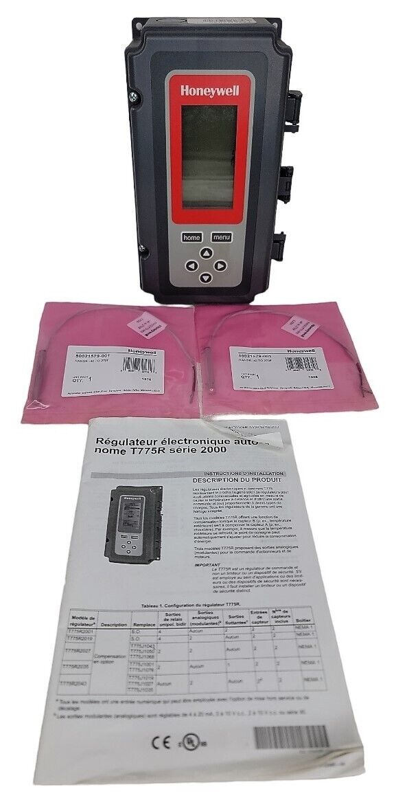 The T775R-2027 is part of the Honeywell T775 series of electronic remote temperature controllers, developed to improve accuracy and flexibility in heating, cooling, and process applications. It supports inputs from NTC temperature sensors and standard analog signals, enabling versatile system integration. This model features multiple relay outputs with programmable setpoints, time delays, and reset functions for tailored operation. A built-in LCD display with intuitive navigation allows easy configuration, monitoring, and diagnostics. With its ability to manage complex temperature and control strategies, the T775R-2027 reduces energy costs while improving reliability compared to legacy mechanical controls. Rugged housing and field-selectable options ensure dependable operation in industrial and commercial environments.