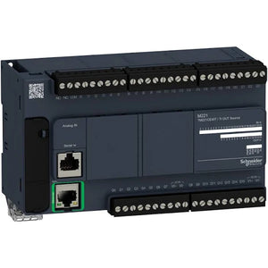 This TM221 controller is part of the Modicon M221 Logic controller range. It has 40 logic I/O and it is supplied with 24V DC. It is supplied with removable screw terminal blocks for connecting the I/O, a removable screw terminal block for connecting the power supply, a button cell backup battery BR2032 and a cable for connecting the analog inputs. M221 logic controllers have three types of integrated communication port, Ethernet, RS 232/RS 485 serial link and USB mini-B programming port. It enables the control of simple machines. The capacity of M221 logic controllers can be enhanced with the Modicon TM3 expansion module offer.