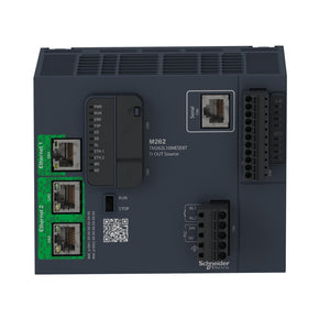 Programmable Logic Controller (PLC) CPU processor module with integrated I/Os - IIoT-ready - up to 3 additional Ethernet networks - Schneider Electric / Modicon (Modicon M262 series) - 256MB (RAM for data and applications) - 8I/Os [4DI (4 x digital inputs (24Vdc; Sink)) + 4DO (4 x digital outputs (24Vdc; 5A; Source))] - with Ethernet/IP + Modbus TCP + RS-232 + RS-485 communication capability - Supply voltage 19-30Vdc (24Vdc nom.) - symmetrical rail or pnl. mounting - with removable spring term. blck. - IP20 - Rated for (horizontal mounting) -4...+140°F / -20...+60°C ambient