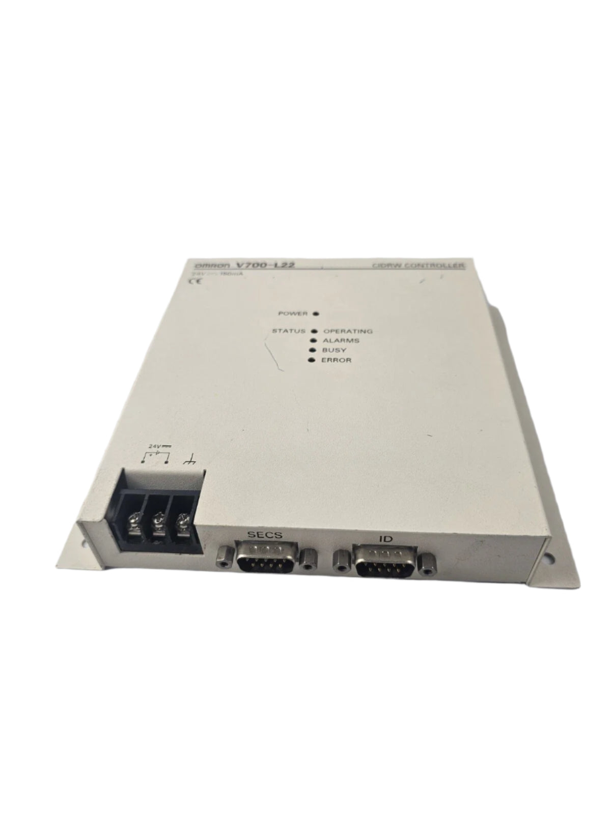 The Omron V700-L22-V2-5 offers dependable RFID communication control for cleanroom and industrial applications requiring 134 kHz Carrier ID tag tracking. Its SECS/GEM compliance, compact form, and legacy compatibility make it a key component for supporting older FOUP management and material tracking systems.