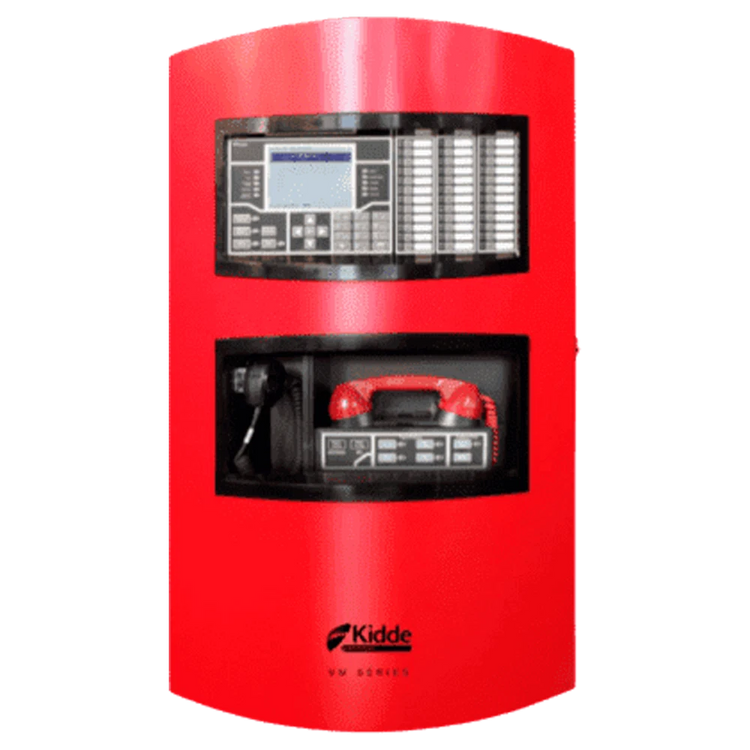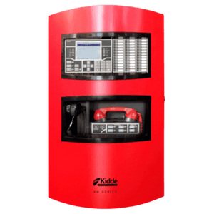 The Kidde Commercial VM-1R is an intelligent fire alarm control panel with an integrated user interface housed behind a red door enclosure. Designed for addressable fire alarm systems, it provides centralized monitoring, control, and system interaction. The VM-1R supports reliable wired connectivity for commercial fire protection applications.