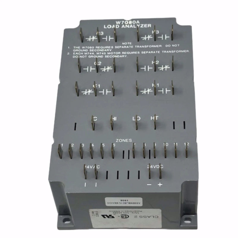 The Honeywell W7080A1016 is a load analyzer designed for multizone HVAC systems, providing coordinated control of heating, cooling, and economizer operation. It manages multiple stages of heating and cooling while responding to zone demand signals to optimize system performance. This controller is intended for packaged rooftop units, furnaces, and split systems operating on 24 VDC control power.